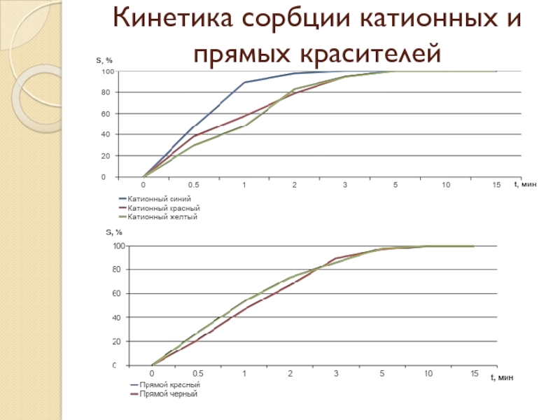Слайд 23Кинетика сорбции катионных и прямых красителей