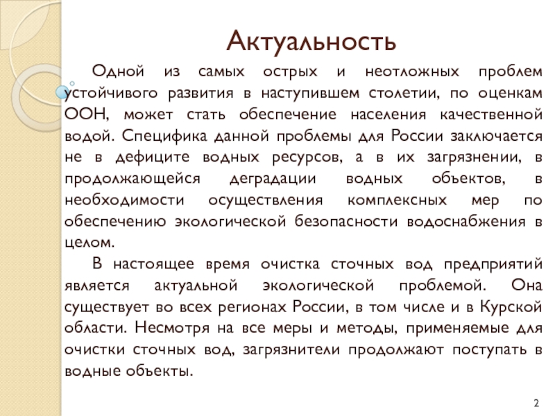 В настоящее время очистка сточных вод предприятий является актуальной экологической проблемой. Она существует во всех регионах России, в том числе и в Курской области. Несмотря на все меры и методы, применяемые для очистки сточных вод, загрязнители продолжают поступать в водные объекты.