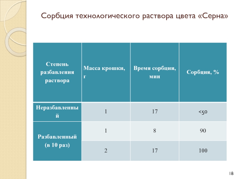 Слайд 18Сорбция технологического раствора цвета «Серна»