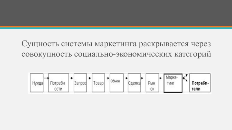 Слайд 3Сущность системы маркетинга раскрывается через совокупность социально-экономических категорий