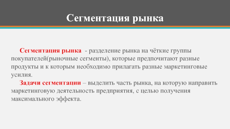 Сегментация рынка - разделение рынка на чёткие группы покупателей(рыночные