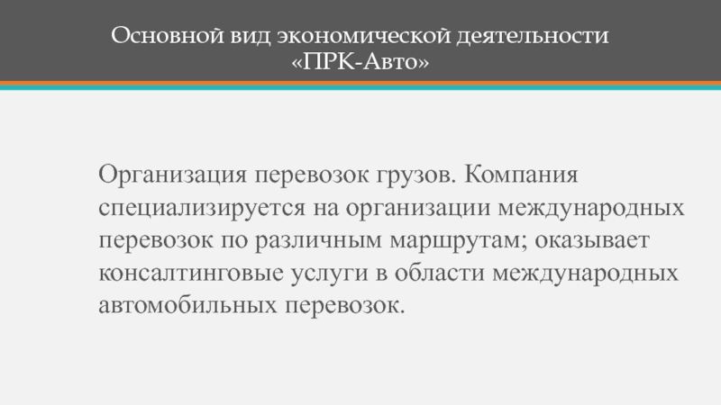 Основной вид экономической деятельности «ПРК-Авто»Организация перевозок грузов. Компания специализируется на организации международных перевозок по различным маршрутам; оказывает