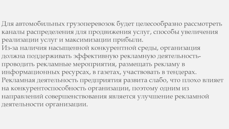 Слайд 9Для автомобильных грузоперевозок будет целесообразно рассмотреть каналы распределения для продвижения