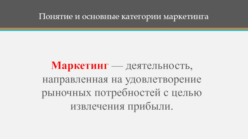 Понятие и основные категории маркетингаМаркетинг — деятельность, направленная на удовлетворение рыночных потребностей с целью извлечения прибыли.