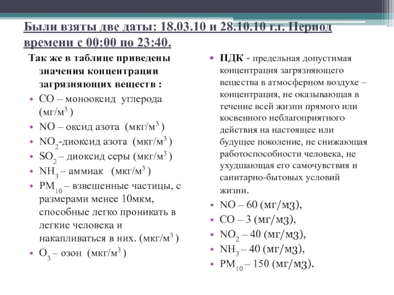 ПДК - предельная допустимая концентрация загрязняющего вещества в атмосферном воздухе – концентрация, не оказывающая в течение всей жизни прямого или косвенного неблагоприятного действия на настоящее или будущее поколение, не снижающая работоспособности человека, не ухудшающая его самочувствия и санитарно-бытовых условий жизни.
