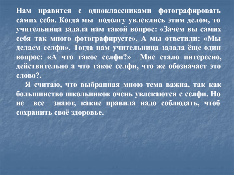 Я считаю, что выбранная мною тема важна, так как большинство школьников очень увлекаются с селфи. Но не все знают, какие правила надо соблюдать, чтоб сохранить своё здоровье.