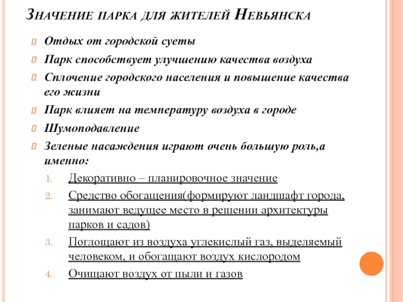 атмосферу. Тем самым образуется сильная загазованность. Также причиной служат различные предприятия, которые «отравляют» воздух вредными веществами. И данные проблемы существуют и в нашем городе. Особенно это касается парков.Парки Невьянска очень красивы, но сильно загрязнены. Особенно красив парк Дворца Культуры. В нашем проекте мы хотим рассказать про этот парк и затронуть тему экологии.