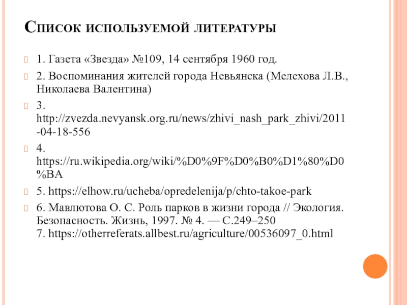 6. Мавлютова О. С. Роль парков в жизни города // Экология. Безопасность. Жизнь, 1997. № 4. — С.249–250