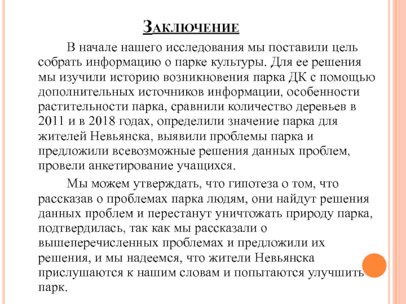 Мы можем утверждать, что гипотеза о том, что рассказав о проблемах парка людям, они найдут решения данных проблем и перестанут уничтожать природу парка, подтвердилась, так как мы рассказали о вышеперечисленных проблемах и предложили их решения, и мы надеемся, что жители Невьянска прислушаются к нашим словам и попытаются улучшить парк.
