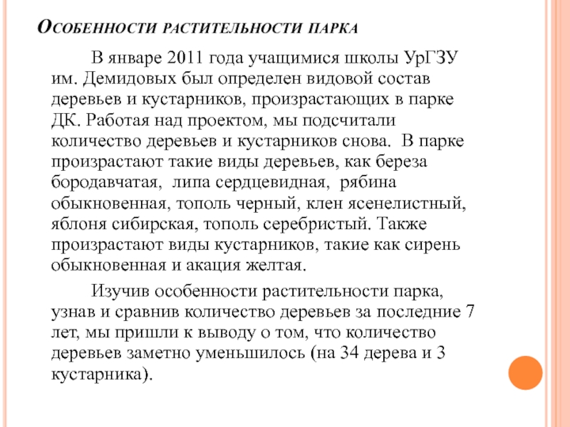 Изучив особенности растительности парка, узнав и сравнив количество деревьев за последние 7 лет, мы пришли к выводу о том, что количество деревьев заметно уменьшилось (на 34 дерева и 3 кустарника).