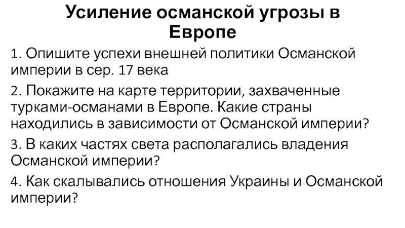 Европе. Какие страны находились в зависимости от Османской империи?3. В каких частях света располагались владения Османской империи?
