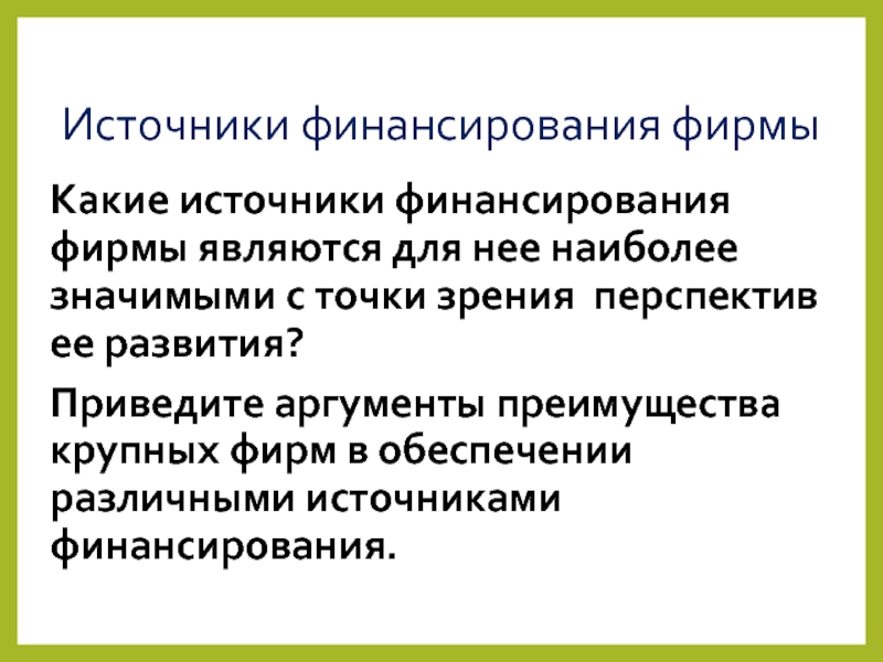 Источники финансирования фирмыКакие источники финансирования фирмы являются для нее наиболее значимыми с точки зрения перспектив ее развития?Приведите аргументы преимущества крупных фирм в обеспечении различными источниками финансирования.