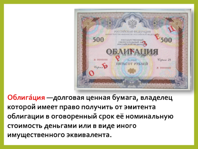 Слайд 13Облига́ция —долговая ценная бумага, владелец которой имеет право получить от