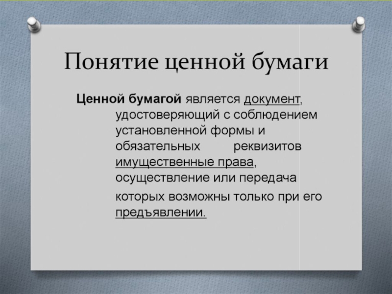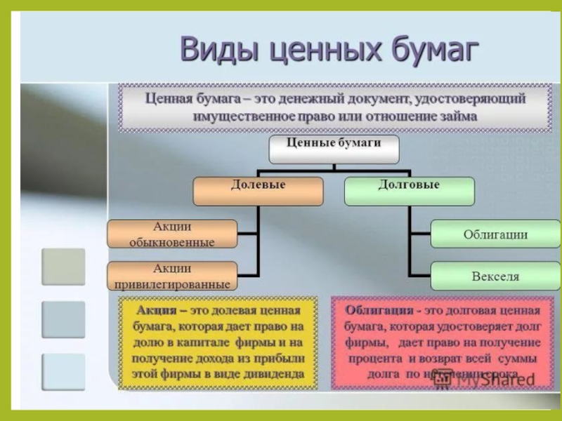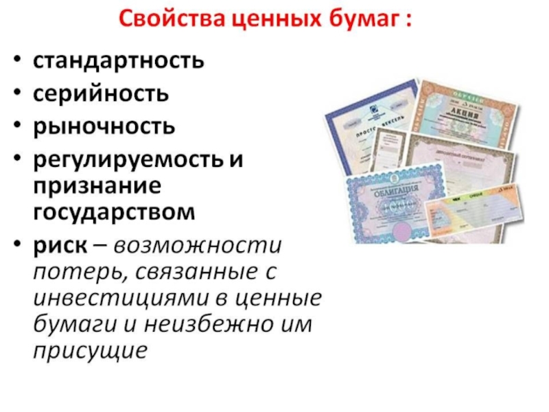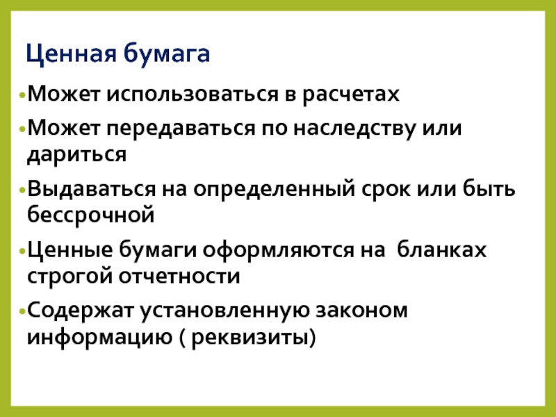 Ценная бумагаМожет использоваться в расчетахМожет передаваться по наследству или даритьсяВыдаваться на определенный срок или быть бессрочнойЦенные бумаги