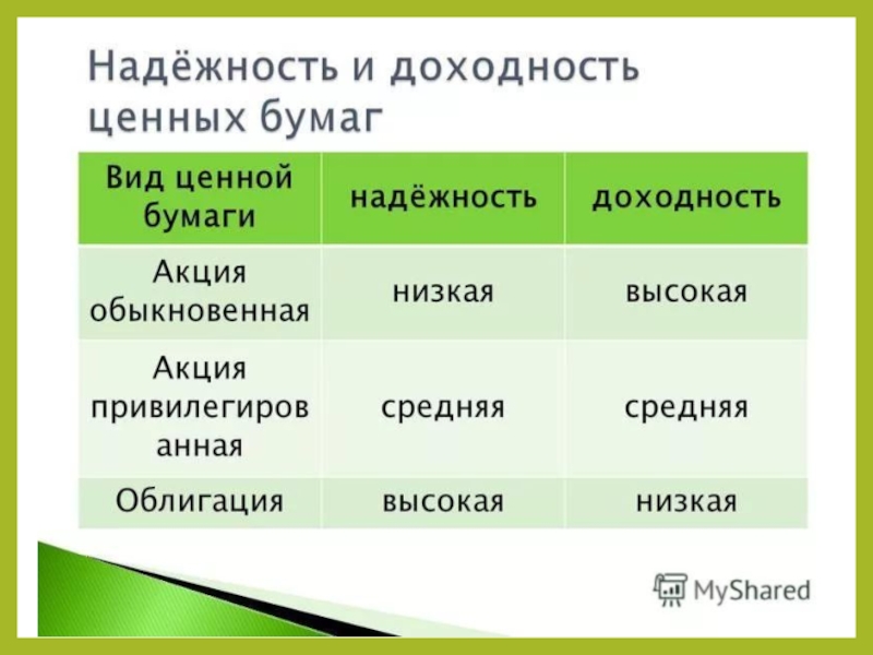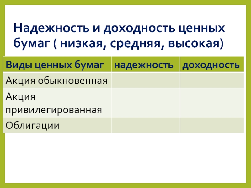 Слайд 19Надежность и доходность ценных бумаг ( низкая, средняя, высокая)
