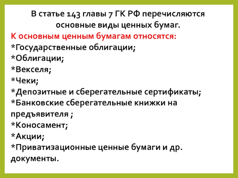 В статье 143 главы 7 ГК РФ перечисляются основные виды ценных бумаг. К основным ценным бумагам относятся: