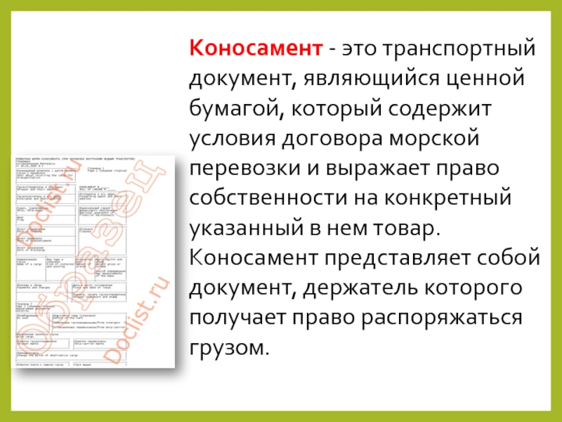Слайд 18Коносамент - это транспортный документ, являющийся ценной бумагой, который содержит
