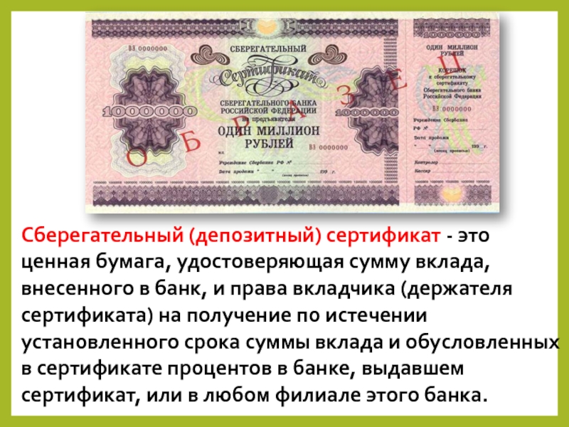 Слайд 16Сберегательный (депозитный) сертификат - это ценная бумага, удостоверяющая сумму вклада,