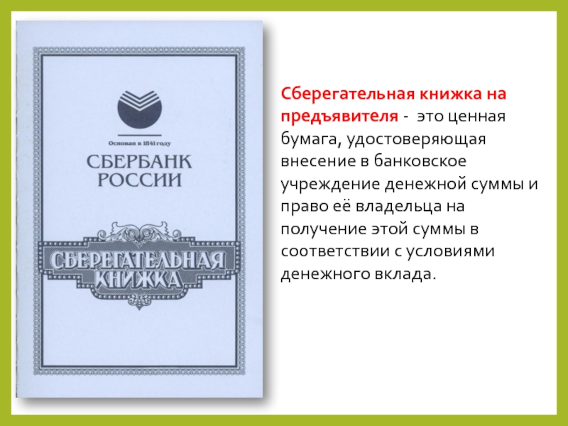 Слайд 17Сберегательная книжка на предъявителя - это ценная бумага, удостоверяющая внесение