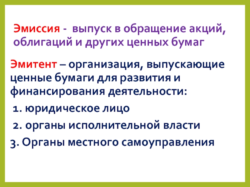 Эмиссия - выпуск в обращение акций, облигаций и других ценных бумаг Эмитент – организация, выпускающие ценные бумаги
