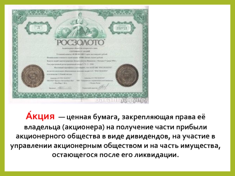 Слайд 12А́кция — ценная бумага, закрепляющая права её владельца (акционера) на