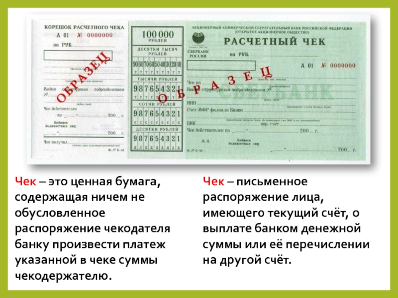 Слайд 15Чек – письменное распоряжение лица, имеющего текущий счёт, о выплате
