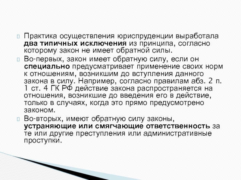 Слайд 65Практика осуществления юриспруденции выработала два типичных исключения из принципа, согласно