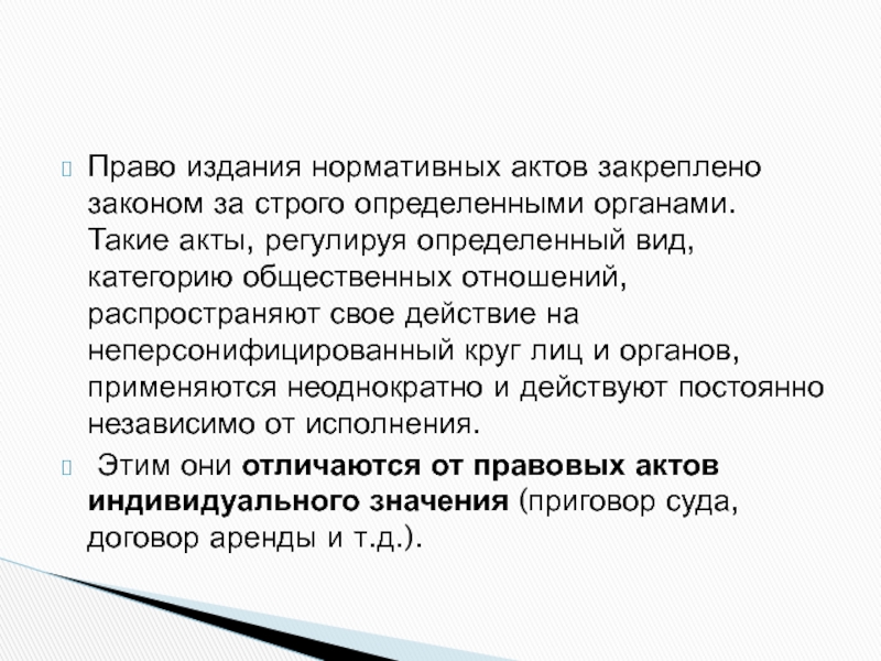 Слайд 20Право издания нормативных актов закреплено законом за строго определенными органами.