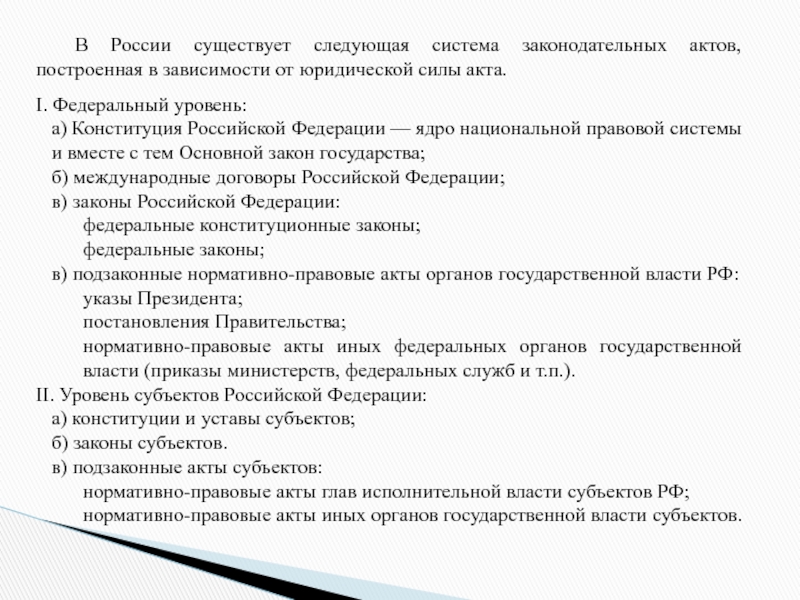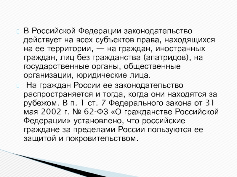 Слайд 71В Российской Федерации законодательство действует на всех субъектов права, находящихся