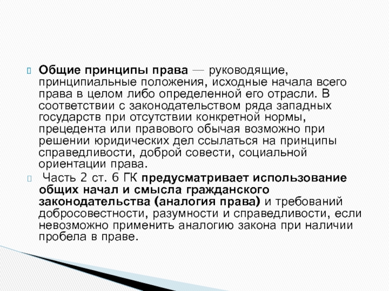 Часть 2 ст. 6 ГК предусматривает использование общих начал и смысла гражданского законодательства (аналогия права) и требований добросовестности, разумности и справедливости, если невозможно применить аналогию закона при наличии пробела в праве.