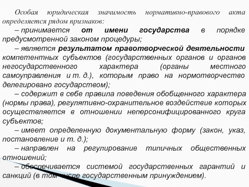 Слайд 18Особая юридическая значимость нормативно-правового акта определяется рядом признаков: