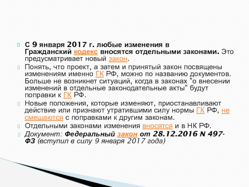 Слайд 62С 9 января 2017 г. любые изменения в Гражданский кодекс вносятся отдельными