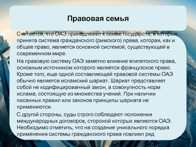 С другой стороны, суды строго соблюдают положения международных договоров, стороной которых являются ОАЭ. Необходимо отметить, что на создание уникального порядка применения системы гражданского права повлиял ряд факторов.