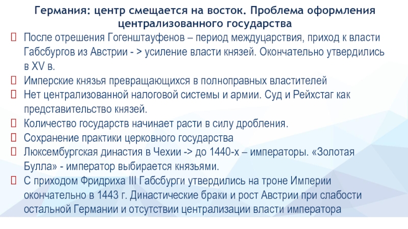 Слайд 29Германия: центр смещается на восток. Проблема оформления централизованного государства