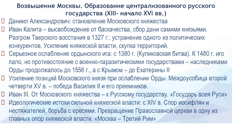 Слайд 30Возвышение Москвы. Образование централизованного русского государства (XIII- начало XVI вв.)