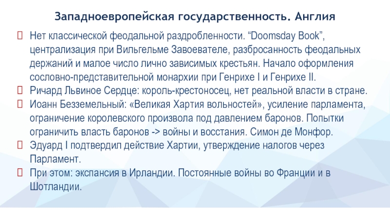 Иоанн Безземельный: «Великая Хартия вольностей», усиление парламента, ограничение королевского произвола под давлением баронов. Попытки ограничить власть баронов -> войны и восстания. Симон де Монфор.