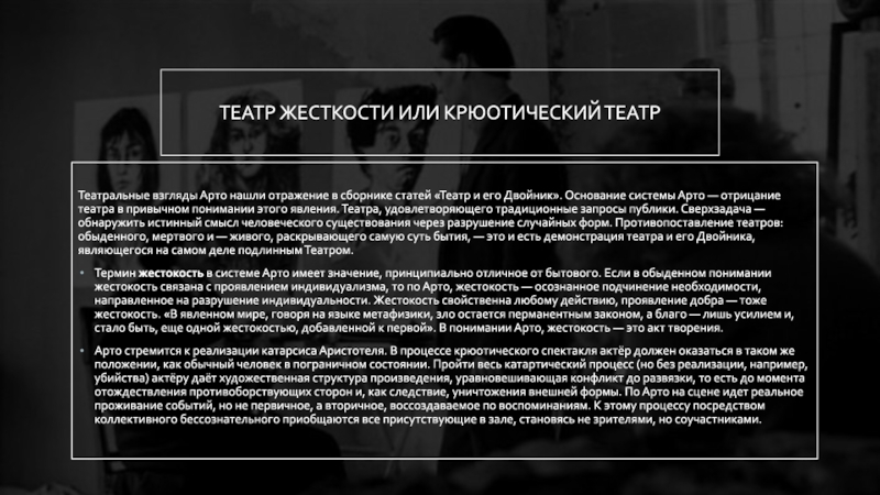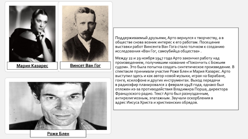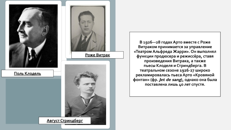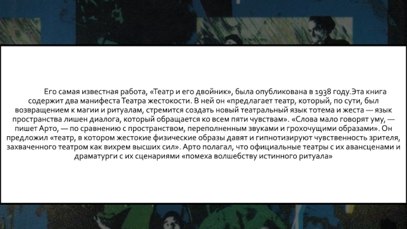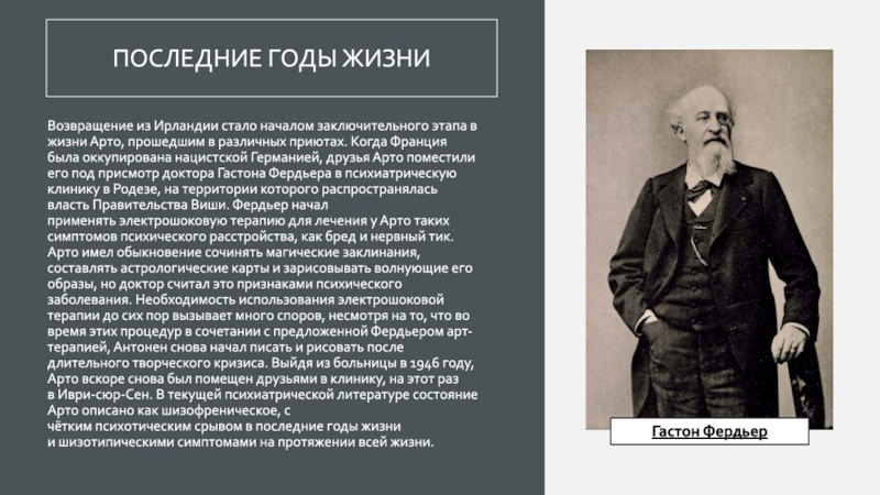 оказало значительное влияние на личность будущего артиста. В возрасте четырёх лет Арто переболел менингитом, следствием чего стало психическое заболевание, от которого он страдал на протяжении всей жизни. Он также страдал от невралгии, заикания и тяжелых приступов депрессии.Первые литературные опыты Антонена Арто относятся к ранней юности, однако большая часть этих произведений была им уничтожена во время приступа депрессии в 1914 году. Последующие несколько лет Арто проводит в различных санаториях, где лечится от душевной болезни. Летом 1916 года его призывают в армию, но вскоре комиссуют по состоянию здоровья. Якобы он был отстранён от военной службы из-за приступов лунатизма.