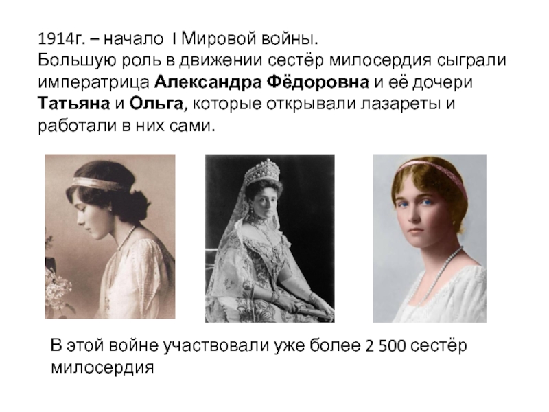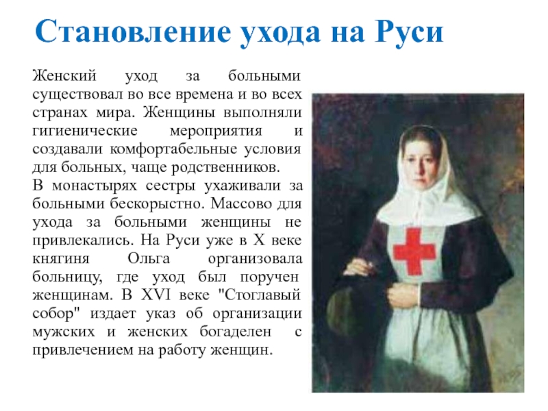 В монастырях сестры ухаживали за больными бескорыстно. Массово для ухода за больными женщины не привлекались. На Руси уже в Х веке княгиня Ольга организовала больницу, где уход был поручен женщинам. В XVI веке "Стоглавый собор" издает указ об организации мужских и женских богаделен с привлечением на работу женщин.