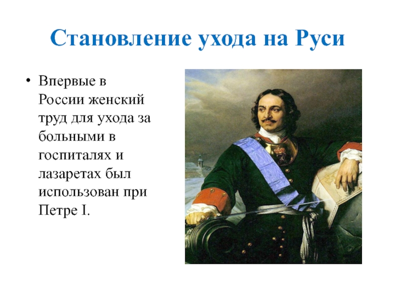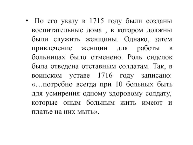 привлечение женщин для работы в больницах было отменено. Роль сиделок была отведена отставным солдатам. Так, в воинском уставе 1716 году записано: «…потребно всегда при 10 больных быть для усмирения одному здоровому солдату, которые оным больным жить имеют и платье на них мыть».