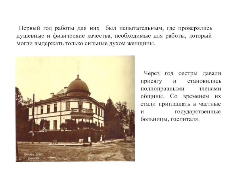 Через год сестры давали присягу и становились полноправными членами общины. Со временем их стали приглашать в частные и государственные больницы, госпиталя.