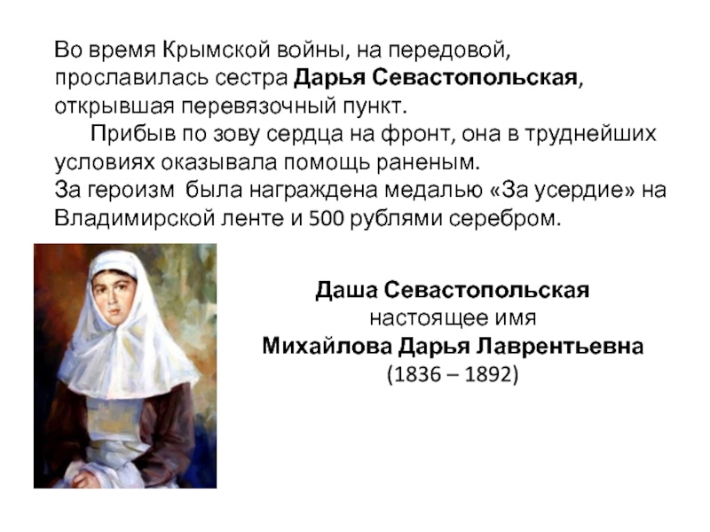 Именно в период Крымской войны русская женщина впервые вышла из сферы домашней жизни на поприще государственной службы, показав высокие деловые и нравственные качества.