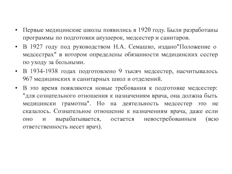 В это время появляются новые требования к подготовке медсестер: "для сознательного отношения к назначениям врача, она должна быть медицински грамотна". Но на деятельность медсестер это не сказалось. Сознательное отношение к назначениям врача, даже если оно и вырабатывается, остается невостребованным (всю ответственность несет врач).