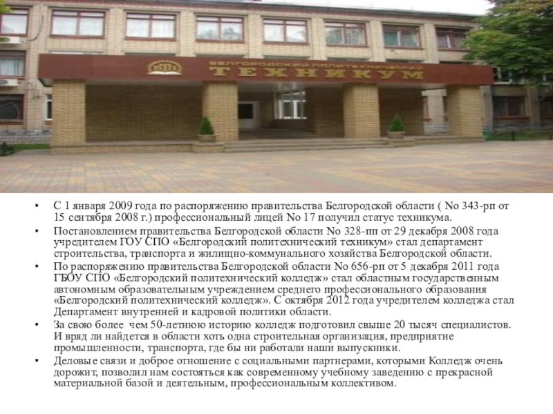 Постановлением правительства Белгородской области No 328-пп от 29 декабря 2008 года учредителем ГОУ СПО «Белгородский политехнический техникум» стал департамент строительства, транспорта и жилищно-коммунального хозяйства Белгородской области.