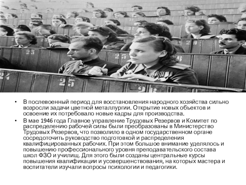 В мае 1946 года Главное управление Трудовых Резервов и Комитет по распределению рабочей силы были преобразованы в Министерство Трудовых Резервов, что позволило в одном государственном органе сосредоточить руководство подготовкой и распределения квалифицированных рабочих. При этом большое внимание уделялось и повышению профессионального уровня преподавательского состава школ ФЗО и училищ. Для этого были созданы центральные курсы повышения квалификации и усовершенствования, на которых мастера и воспитатели изучали вопросы психологии и педагогики.