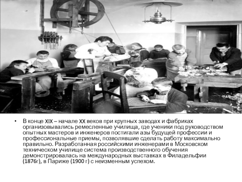 Слайд 11В конце XIX – начале XX веков при крупных заводах и фабриках организовывались ремесленные