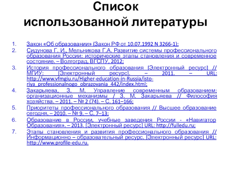 История профессионального образования [Электронный ресурс] // МГИУ: [Электронный ресурс]. – 2011. – URL: http://www.vfmgiu.ru/Higher-education-in-Russia/isto- riya_professionalnogo_obrazovania_442/index.html;