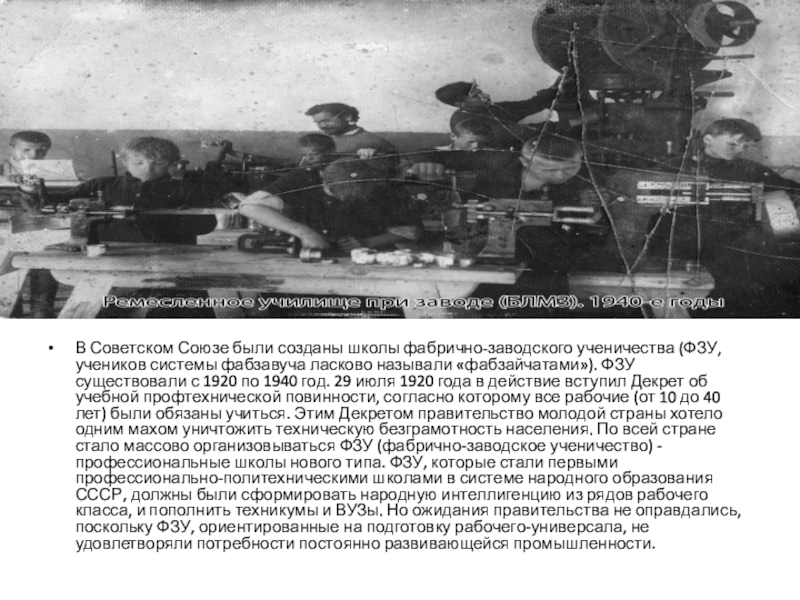 Слайд 13В Советском Союзе были созданы школы фабрично-заводского ученичества (ФЗУ, учеников