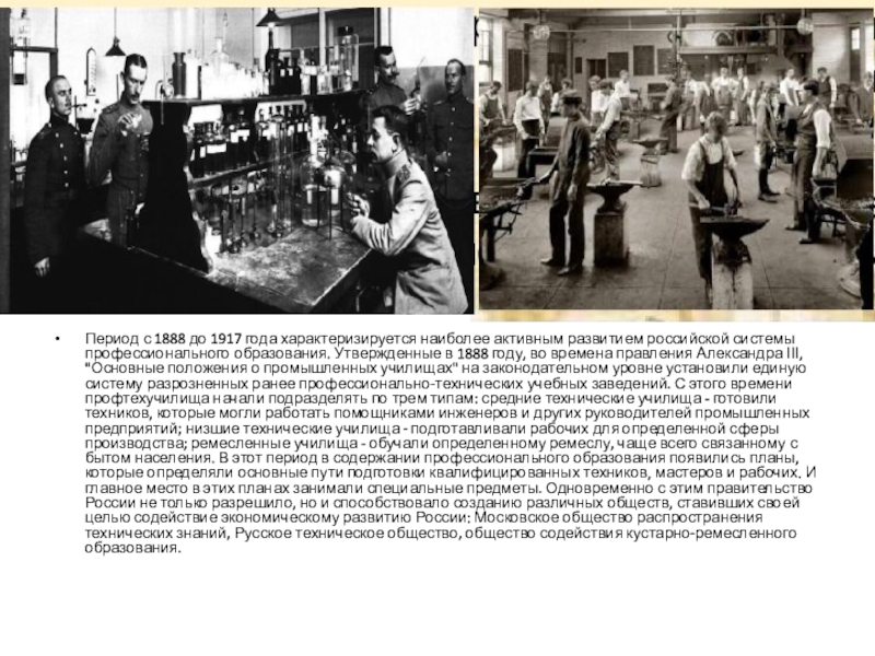 правления Александра ІІІ, "Основные положения о промышленных училищах" на законодательном уровне установили единую систему разрозненных ранее профессионально-технических учебных заведений. С этого времени профтехучилища начали подразделять по трем типам: средние технические училища - готовили техников, которые могли работать помощниками инженеров и других руководителей промышленных предприятий; низшие технические училища - подготавливали рабочих для определенной сферы производства; ремесленные училища - обучали определенному ремеслу, чаще всего связанному с бытом населения. В этот период в содержании профессионального образования появились планы, которые определяли основные пути подготовки квалифицированных техников, мастеров и рабочих. И главное место в этих планах занимали специальные предметы. Одновременно с этим правительство России не только разрешило, но и способствовало созданию различных обществ, ставивших своей целью содействие экономическому развитию России: Московское общество распространения технических знаний, Русское техническое общество, общество содействия кустарно-ремесленного образования.