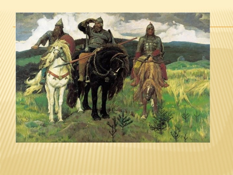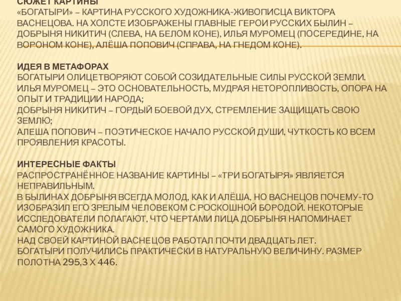 белом коне), Илья Муромец (посередине, на вороном коне), Алёша Попович (справа, на гнедом коне). Идея в метафорах Богатыри олицетворяют собой созидательные силы русской земли. Илья Муромец – это основательность, мудрая неторопливость, опора на опыт и традиции народа; Добрыня Никитич – гордый боевой дух, стремление защищать свою землю; Алеша Попович – поэтическое начало русской души, чуткость ко всем проявления красоты. Интересные факты Распространённое название картины – «Три богатыря» является неправильным. В былинах Добрыня всегда молод, как и Алёша, но Васнецов почему-то изобразил его зрелым человеком с роскошной бородой. Некоторые исследователи полагают, что чертами лица Добрыня напоминает самого художника. Над своей картиной Васнецов работал почти двадцать лет. Богатыри получились практически в натуральную величину. Размер полотна 295,3 х 446.