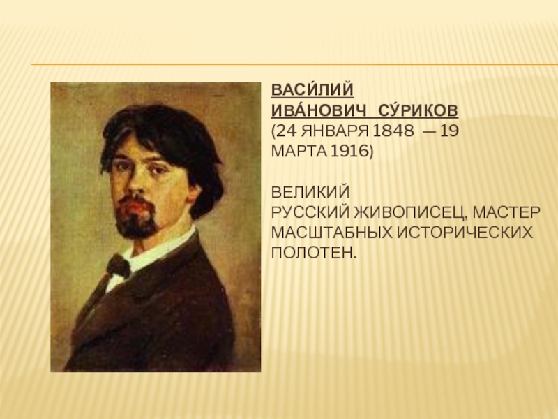 Ива́нович Су́риков (24 января 1848  — 19 марта 1916) великий русский живописец, мастер масштабных исторических полотен.